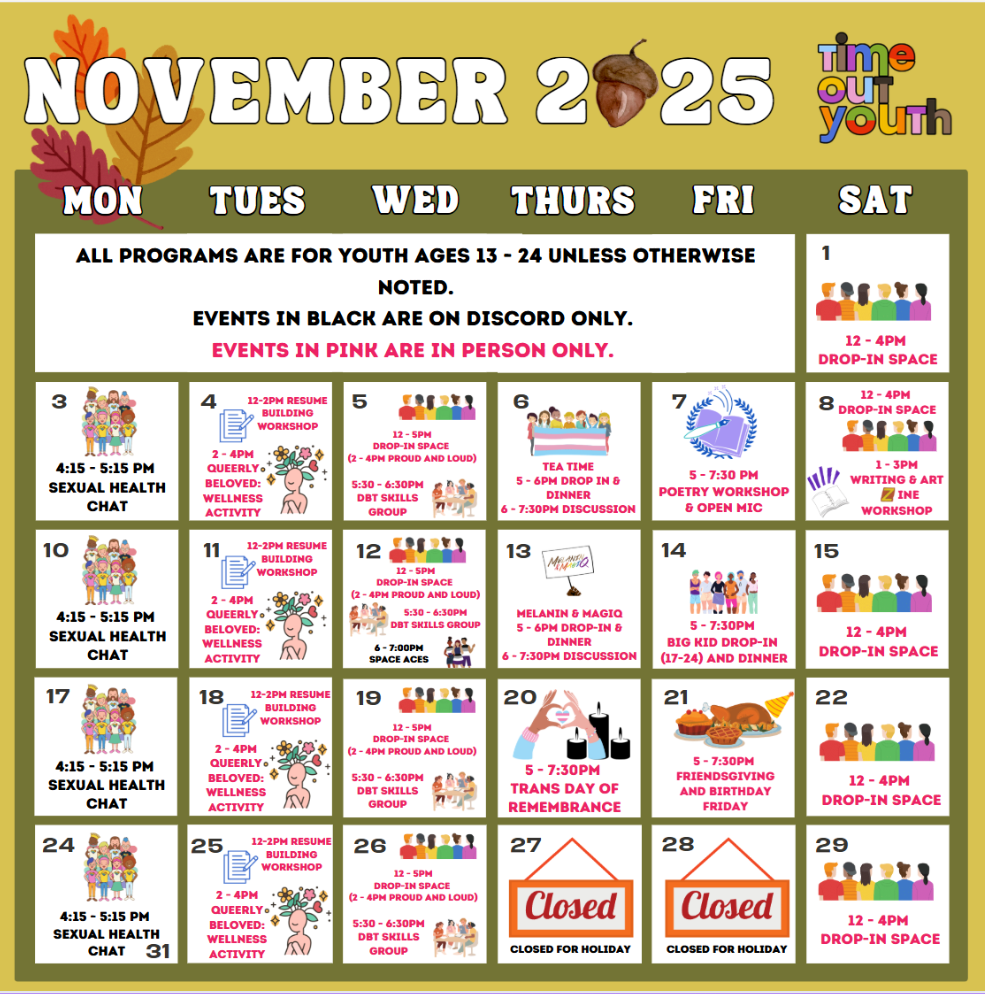 Thank you for joining the Time Out Youth family. Volunteers are an essential part of creating safe, affirming spaces for LGBTQ+ youth. In this orientation, you’ll learn about our mission, history, policies, and the wide range of services we provide. By the end, you’ll feel confident and prepared to support young people, connect them with resources, and represent Time Out Youth in the community.